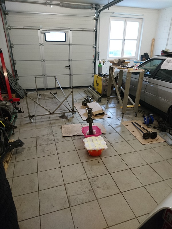Es wurde ein Holzgestell gebaut, um das Chassi zu transporiteren auf dem Hänger. Die Idee mit dem rollbaren Gestell wurde wieder verworfen, da der Untersatz zwar iin den Hänger gepasst hätte, jedoch keine Stabilität zu erreichen gewesen wäre. Zudem hätte ich mit der Höhe die 3 Meter geknackt was mir nun definitv zu unsicher war.